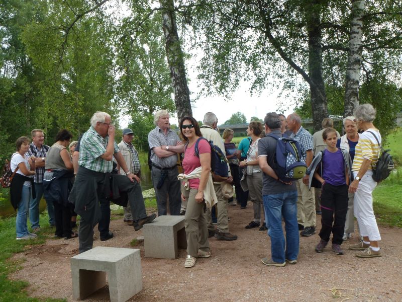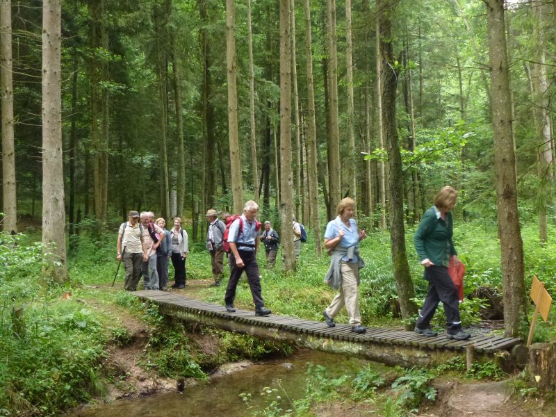 Durch das Gutachtal ging es auf der Uhrenstraße über Triberg mit den bekannten Wasserfällen weiter auf der Schwarzwaldhochstraße über Furtwangen entlang der Breg nach Donaueschingen. Die Breg ist mit 48 Kilometern der längste Quellfluss von den Flüsschen Brigach und Breg. In Donaueschingen ging es zum Donauquelltopf, der zwischen der Stadtkirche Sankt Johann und dem Schloss liegt. Hier teilte sich die Gruppe. Die etwas Fußkranken erkundeten die hübsche Innenstadt oder besuchten eines der schönen Straßencafés. Der Rest der Gruppe unternahm einen Spaziergang durch den Fürstlichen Schlosspark zum Zusammenfluss von Brigach und Breg. An Schautafeln konnten sich die Mitwanderer informieren und ihr Wissen über die Donau erweitern. Auch sie kamen anschließend noch in den Genuss, ein Café zu besuchen.