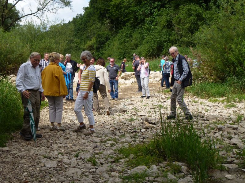 Um 14.30 Uhr fuhr der Bus zum letzten Ziel nach Möhringen zur Donauversickerung. Hier konnte sich jeder ein Bild machen, dass die Donau für ein Stück verschwunden ist. Somit konnte man das Flussbett der Donau trockenen Fußes betreten und alle waren von dem Naturereignis beeindruckt, wo die Donau auf diesem Streckenabschnitt bleibt. Grund für die Versickerung sind die im Jura entstandenen Gesteinsschichten.