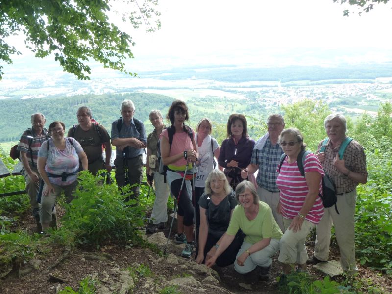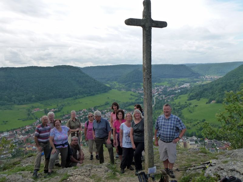 14 Wanderer zeigten ihr Interesse an der Sommerwanderung am ersten Augustsonntag hoch über Deggingen. Bei idealem Wanderwetter ging es vom Start in Deggingen über den Sommerberg durch den Wald aufwärts zum Aussichtspunkt Nordalbfelsen mit Kreuz. Hier hatte die Gruppe einen herrlichen Blick auf Deggingen, das Obere Filstal und die gegenüberliegende Ruine Hiltenburg.