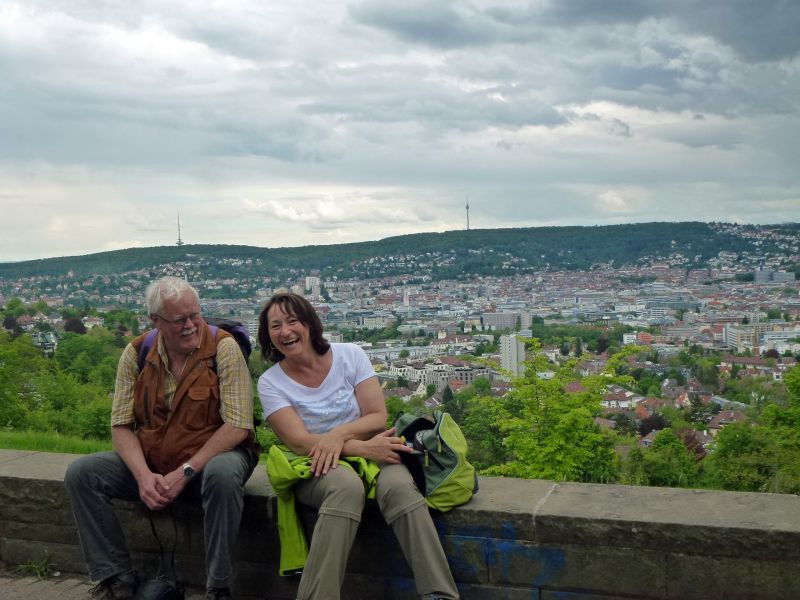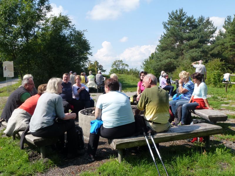 Nach einem kurzen Aufenthalt ging es weiter an einen Wanderparkplatz mit Mittagspause. Gestärkt zog die Gruppe aufwärts zum Birkenkopf, der im Volksmund auch als „Monte Scherbelino“ bekannt ist. Eine angebrachte Tafel erinnert an deren Herkunft. Den Wanderern bot sich von der Anhöhe ein fantastischer Blick auf die Stadt Stuttgart im Talkessel.