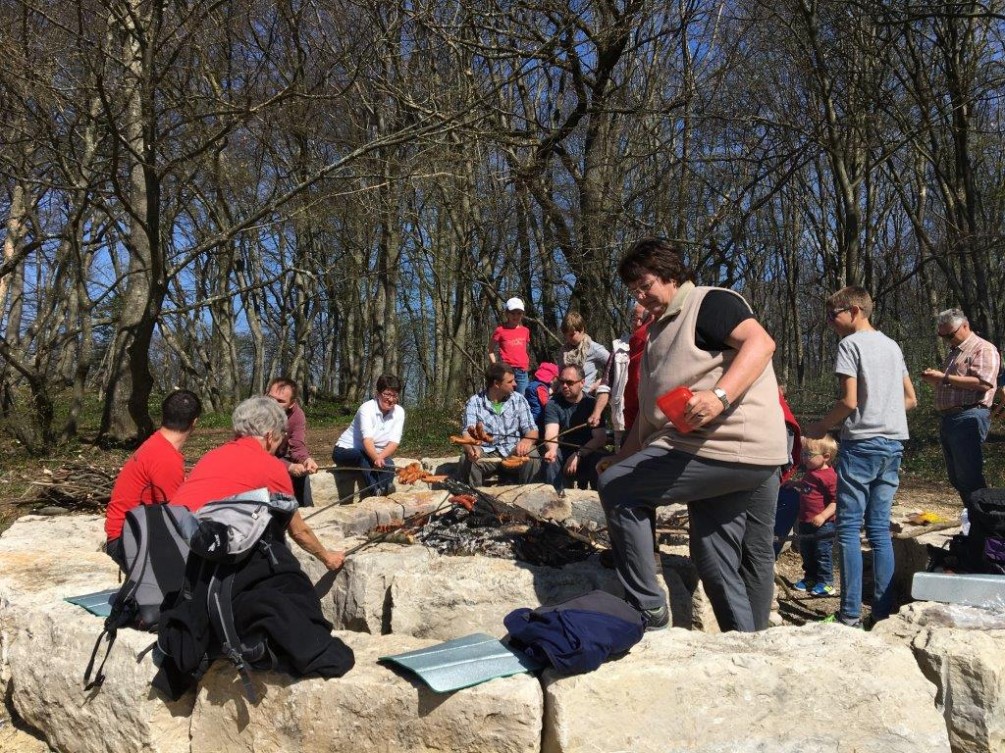 Über einen Holzsteg erreichten die Wanderfreunde ein schönes Plätzchen für die Mittagspause. Vorsorglich wurden Holzstücke in den Rucksäcken mitgebracht, um diese an der Grillstelle zu entzünden. Unter dem überdachten Grill fand jeder ein gemütliches Plätzchen und so konnten die aufgespießten Würste in der heißen Glut braten. Hier ließ es sich gut sein! Aber alles hat ein Ende und die Wanderer setzten die Route fort.