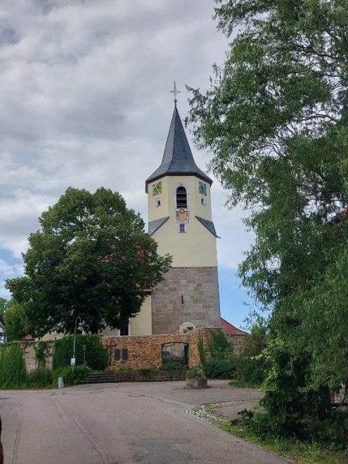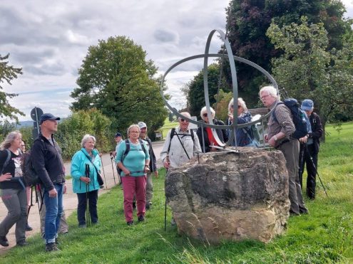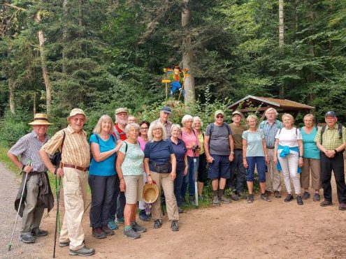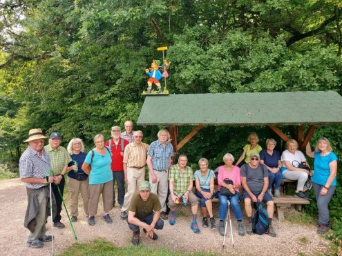 Trotz anfänglichem Regen machten sich 15 Wanderer der Seniorengruppe 1 auf den Weg vom Schloss Donzdorf, um einen Teil des Kapellenwegs zu erwandern. Zuerst führte die Tour durch den Schlossgarten und vorbei am Feuersee. Über 150 Stufen ging es hoch und weiter durch den Wald zur Kapelle St. Laurentius in Hürbelsbach.