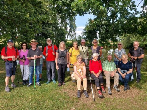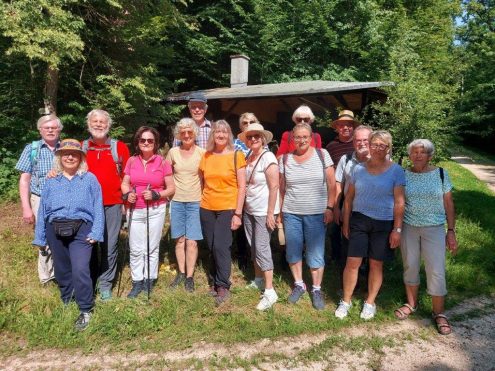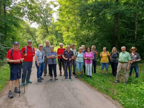 Die Seniorengruppe 1 startete am Kloster Adelberg bei der Juliwanderung bei schönem Wetter mit 17 Wanderern. Auf einem direkt abwärts führenden Weg ging es von der Klosteranlage durch ein Waldstück hinab an den Rand des Herrenbachstausees. Durch die Herrenmühle führte der Weg aufwärts in ein schönes Waldgebiet.