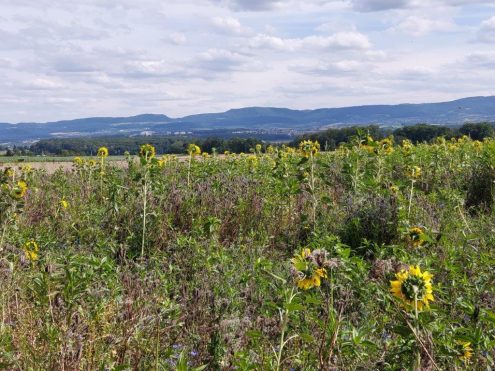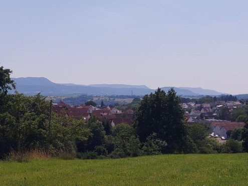 Später ging es entlang am Waldrand durch eine schöne Natur mit einem herrlichen Blick auf Eislingen und auf die Erhebungen der Schwäbischen Alb im Hintergrund, bis die Wandersleute den Stadtrand von Eislingen streiften.