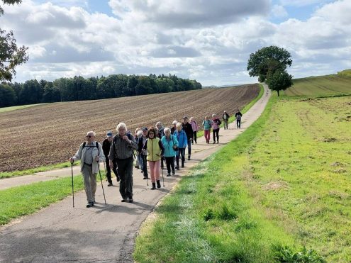 Vom Wanderparkplatz Wacholderheide führte die Aprilwanderung der Seniorengruppe 1 mit Monika Lechner bei zuerst sonnigem Wetter um den Hühnerberg, der auf einer Höhe von 760 Metern liegt. Zu Beginn ging es entlang an einem kleinen Waldstück und weiter auf geteerten Landwirtschaftswegen. Durch Felder, Wiesen und Wälder wanderten die Senioren auf der Albhochfläche durch eine schöne Landschaft mit weiten Ausblicke ins Umland.